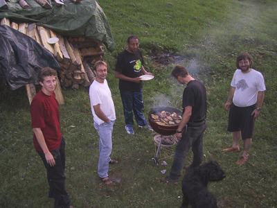 Bald waren die Vergifteten wieder am Xpilot, während es Diskussionen gab, Peter Gleitschirm fliegen ging, einige mit Cora spielten, etc. Kaum sass ich im Auto und wollte Zopf und Abwaschmittel einkaufen, bekam ich einen telefonischen Hilferuf und machten einen kleinen Umweg über Spiez und Bern. Am Abend wurde wieder grilliert (Tannenholz hält nicht lange die Glut, deshalb musste ich die Jungs von den Notebooks in die Küche scheuchen). ![]() Cora überraschte viele Anwesenden, dass sie sogar im Gras abgestellte Teller mit Fleisch ignorierte und sich von der ganz pflegeleichten Seite zeigte. Dank eines Missverständnisses hatten wir nun statt Brot-Mangel einen Brot-Überschuss und schlemmten hemmungslos (Stichwort: Satziki mit mehr Knoblauch als Gurke)... Die Übertragung von DVD-Filmen auf den Beamer klappte nicht wunschgemäss, und die ganz harten Gamer gingen erst im Morgengrauen ins Bett.